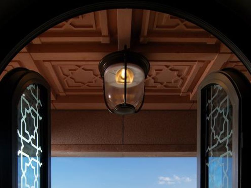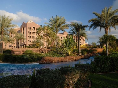 Здание отеля представляет собой стилизованный сказочной красоты дворец с традиционной арабской архитектурой, который, будто по мановению волшебной палочки, вырос среди бесплодной пустыни. В центре дворцового комплекса возвышается огромный купол, выложенный цветной мозаикой, он окружен куполами поменьше, всего куполов - 114, и каждый из них украшен золотым шпилем. Цветовая гамма дворца воспроизводит многочисленные цветовые нюансы песков Аравийской пустыни, а вокруг дворца на огромной территории (100 га.) образовался удивительный зеленый оазис.